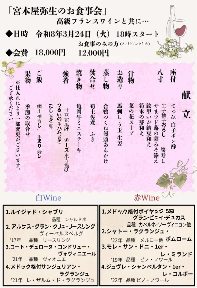2026.2.28 宮本屋弥生のお食事会 🍷ワイン会のご案内